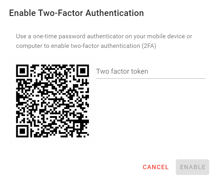 Na het scannen van de QR-code en het invullen van de Two-Factor-token, klik je op ENABLE om 2FA te activeren. Als alles correct is ingevuld, verschijnt er een groen vinkje achter de status.