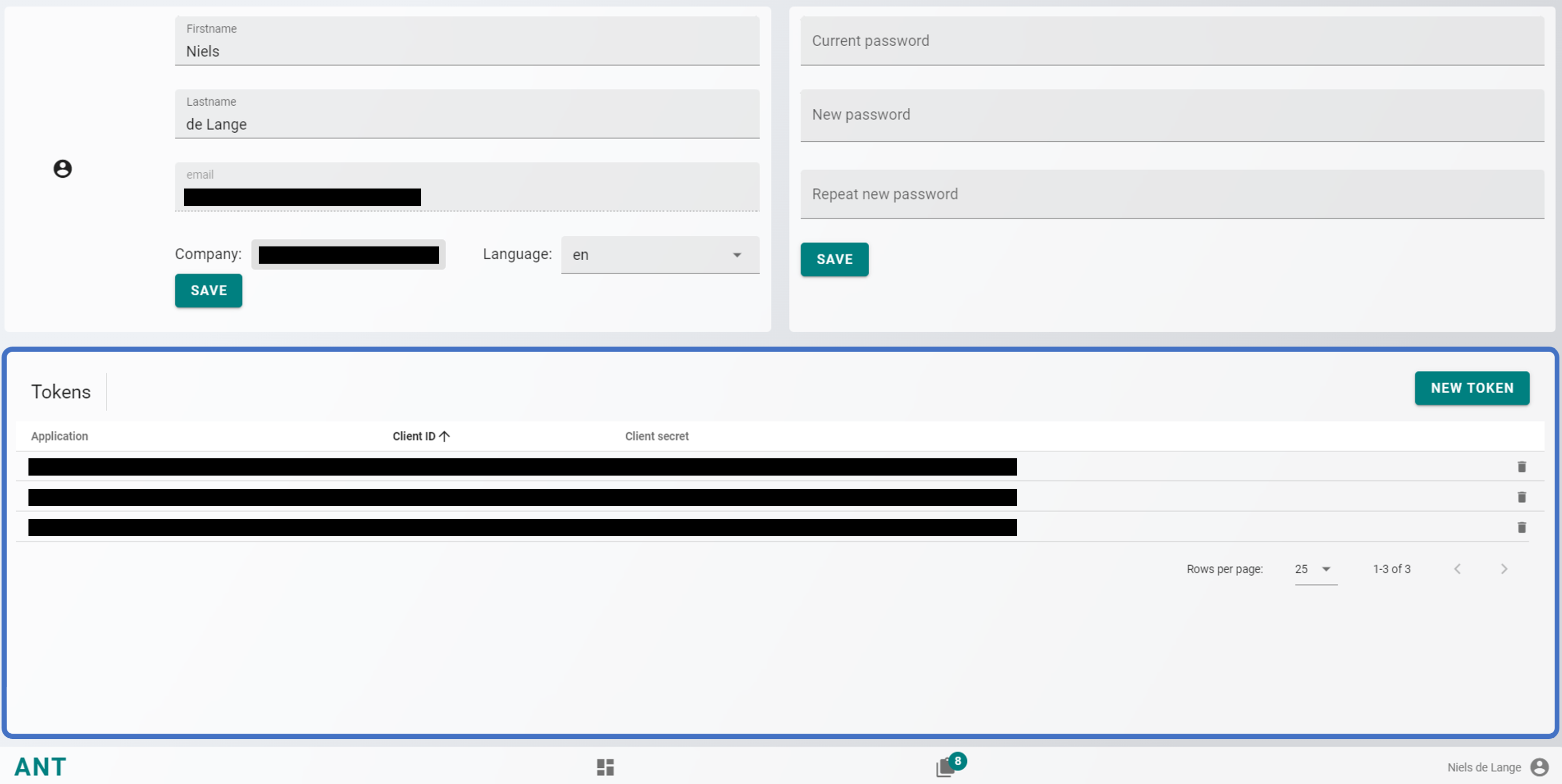 Een Client ID en Client Secret worden gebruikt om de verbinding met jouw account mogelijk te maken vanuit andere applicaties, bijvoorbeeld in Dynamo. Onderaan de pagina vind je alle aangemaakte tokens. Om een nieuwe token aan te maken, klik je op NEW TOKEN.