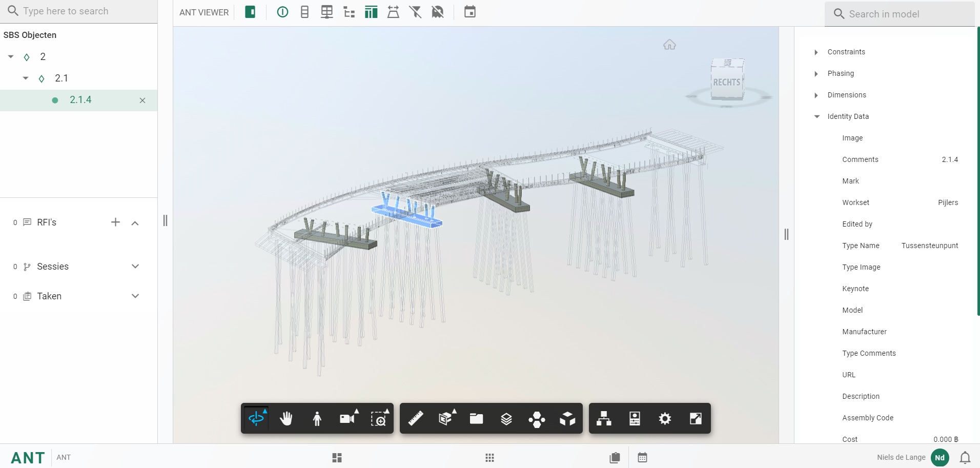 In het Overview overzicht kunnen alle gekoppelde SBS codes ingezien worden. Gebruik de SBS boom aan de linker kant om een SBS object aan te klikken, aan de rechterkant van het scherm kunnnen alle tabellen, taken, sessie en RFI's overzichtelijk ingezien worden die aan deze SBS code zijn gekoppeld.