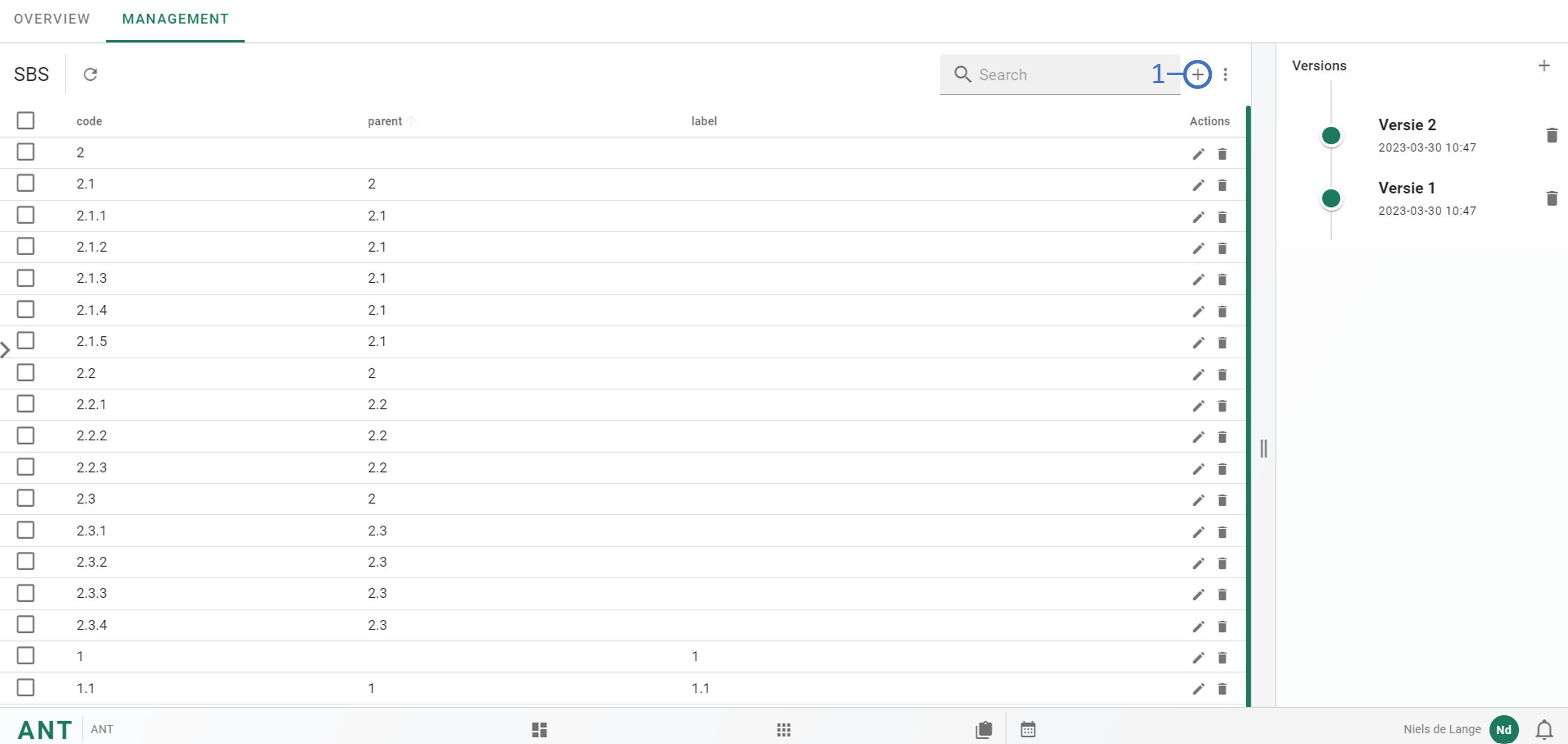 Onder het kopje management kunnen er SBS objecten aangemaakt worden en zo ook SBS bomen opgebouwd worden. Om een SBS object toe te voegen kan er op + gedrukt worden 1️⃣. Hier word voor de code gevraagd, de parent (als de SBS code een parent heeft) en de label naam, Parent en Label naam zijn optioneel. Druk na het invullen op SAVE om het SBS object toe te voegen.