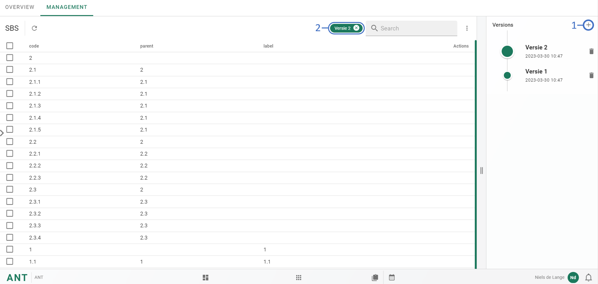Om verschillende revisies te maken van de SBS boom kan er aan de rechterkant van het scherm achter Versions op + gedrukt worden 1️⃣. Er wordt gevraagd om de versie naam, na het invullen kan er op SAVE gedrukt worden om de versie aan te maken. Alle aangemaakte versie worden aan de rechterkant van het scherm weergegeven. Er kan op de naam van de versie gedrukt worden om deze te bekijken, om uit de versie te gaan kan er op x gedrukt worden 2️⃣.
