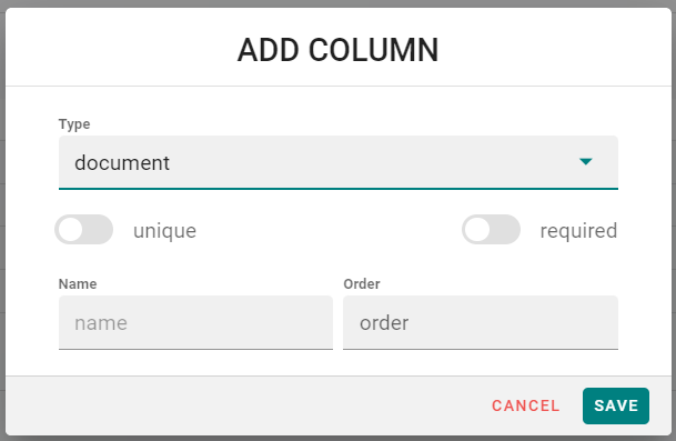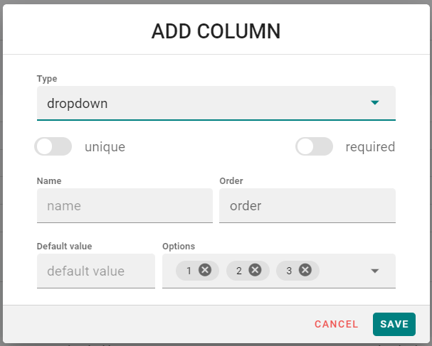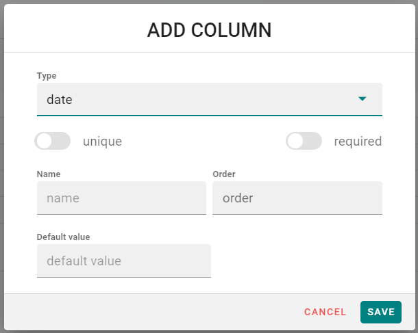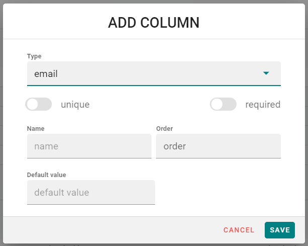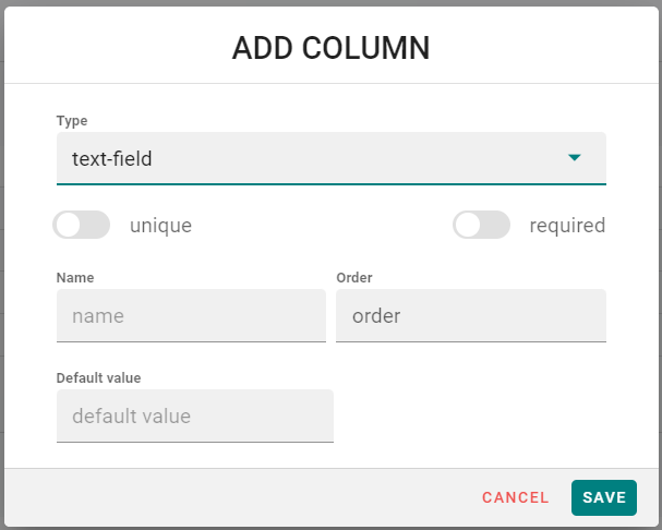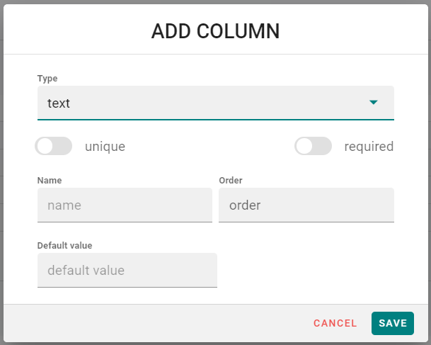 Voodat er records kunnen aangemaakt worden moeten er kolommen toegevoegd worden aan de tabel. Dit kan gedaan worden door op + te drukken achter "Columns". Er wordt gevraagd naar de type, de naam, order en hint van de kolom.