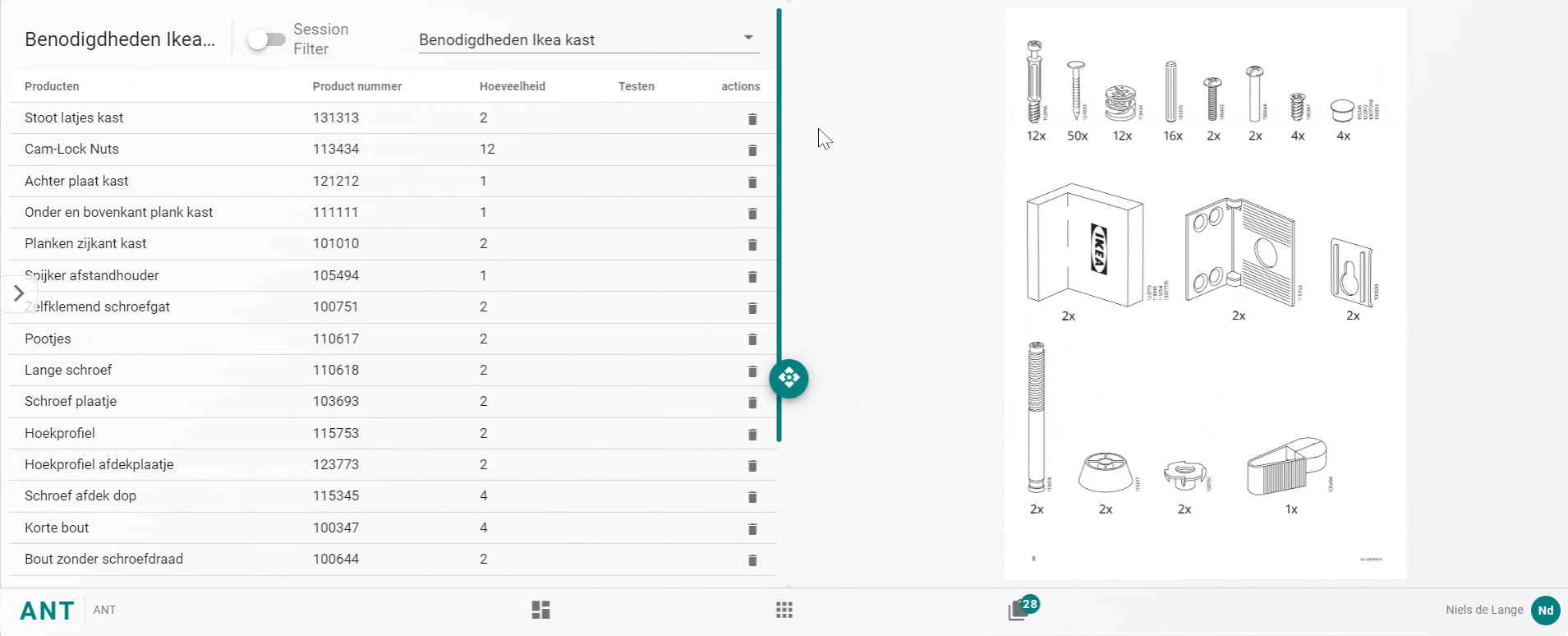 Hier word je doorgestuurd naar een overzicht met alle sessies die zijn gestart van de gekozen workflow. Om verder te gaan met een sessie kan er op de sessie gedrukt worden. Om een sessie te verwijderen kan er op het achter de sessie naam gedrukt worden.
