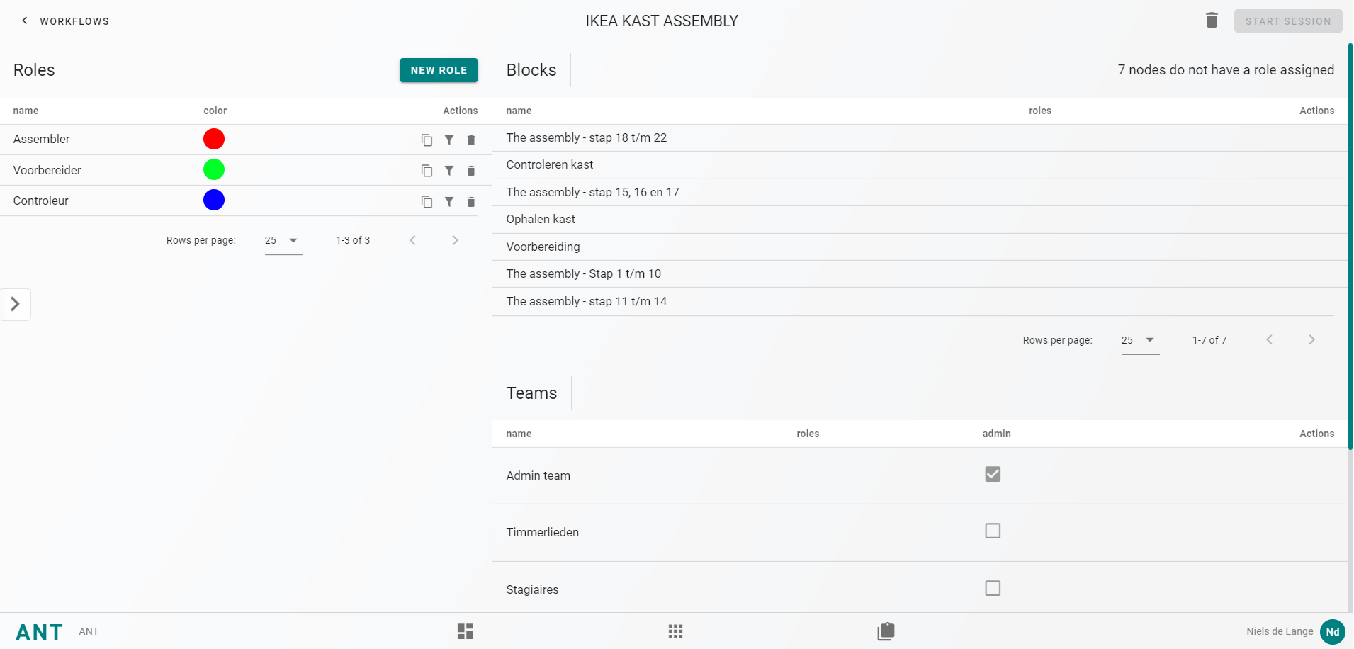 Als u geassigned bent aan een workflow stap kunt u deze op twee manieren openen, via het session scherm of via de taken. Druk op START om de stap te starten.