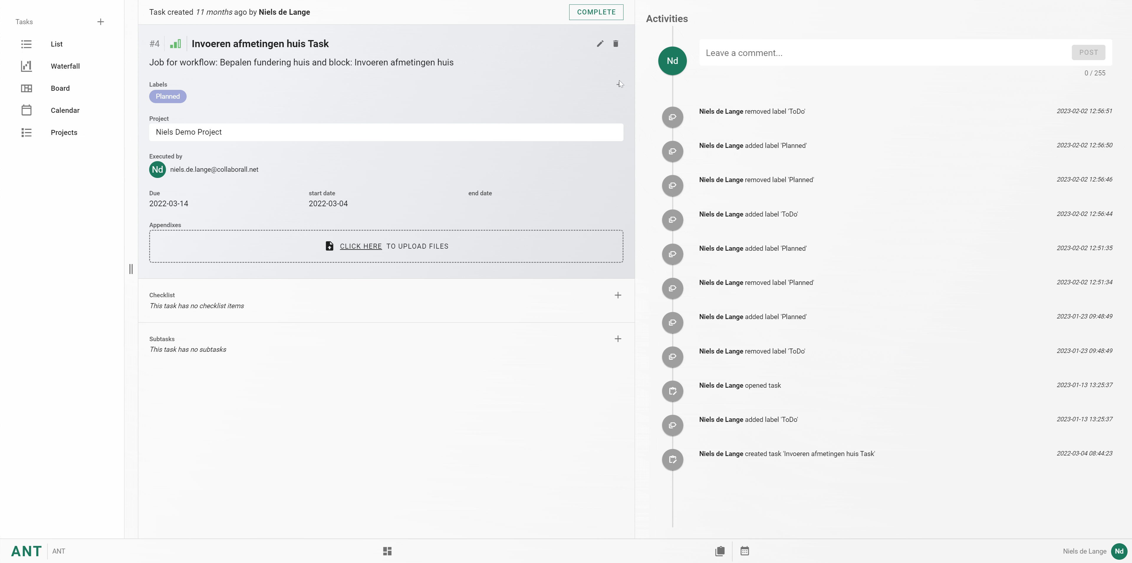 In het taken detail scherm kunnen taken in detail worden bekeken, hier kan ook het gehele taken geschiedenis bekeken worden. Verder kunnen hier checklists gemaakt worden.